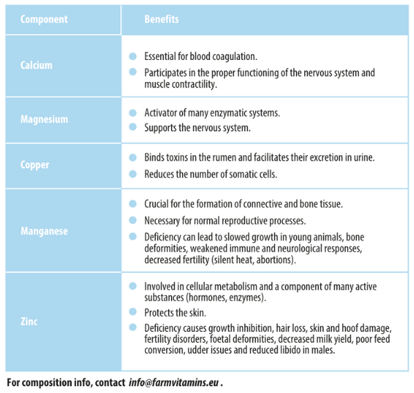 ✓ Recommended administration: should be administered during the periparturient period or in cases of calcium deficiency.
