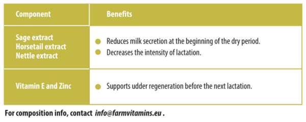 ✓ Supports milk yield stoppage: aids in the effective cessation of milk production during the dry period.